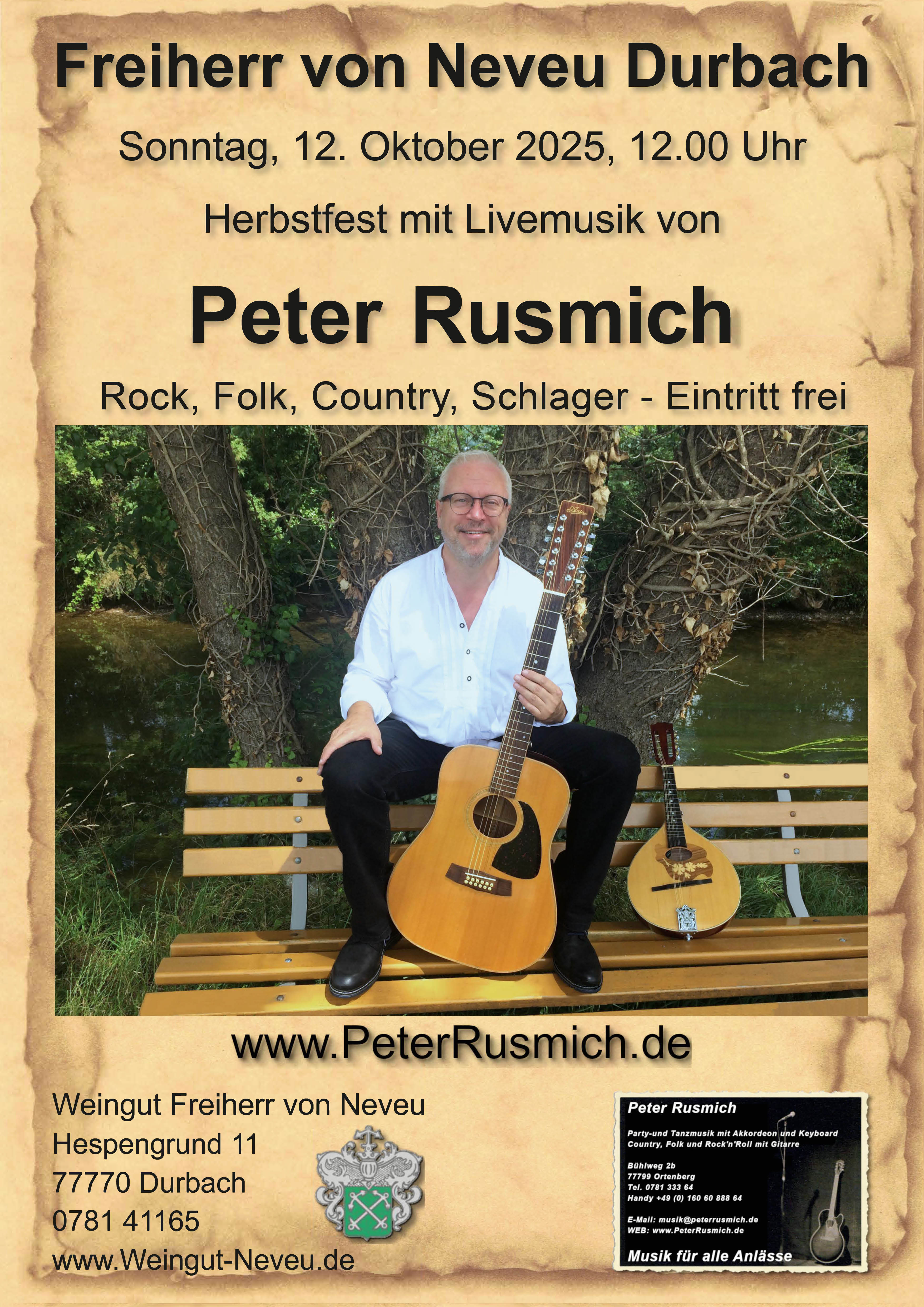 Herbstfest mit Alleinunterhalter Peter Rusmich und kulinarischen Spezialitäten aus der eigenen Gutsküche. Eintritt frei!